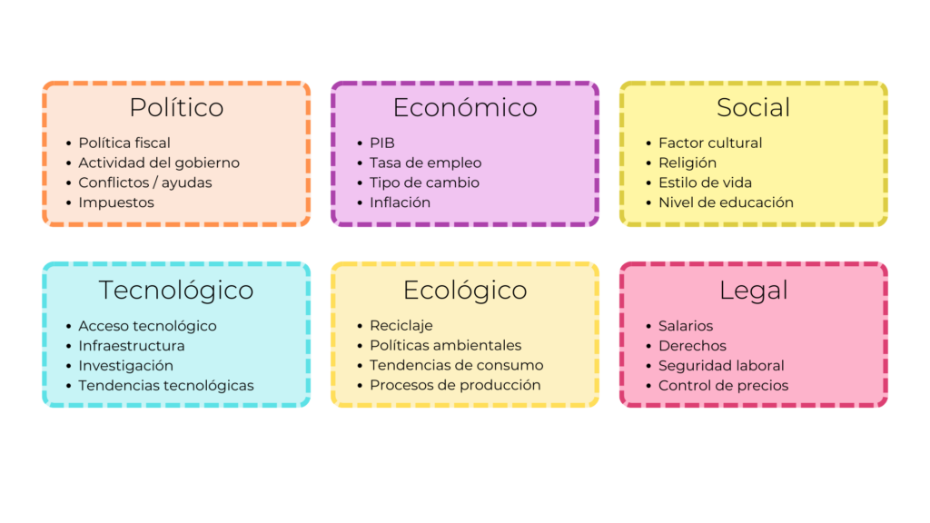 - Político: por ejemplo, cambios en el gobierno, en la normativa, en las leyes.